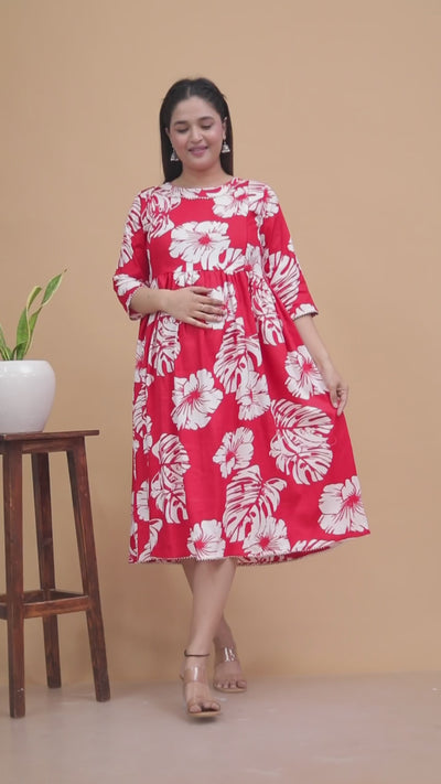 Red & White Tropical Leaf Print Rayon Maternity Feeding Dress with Zippers